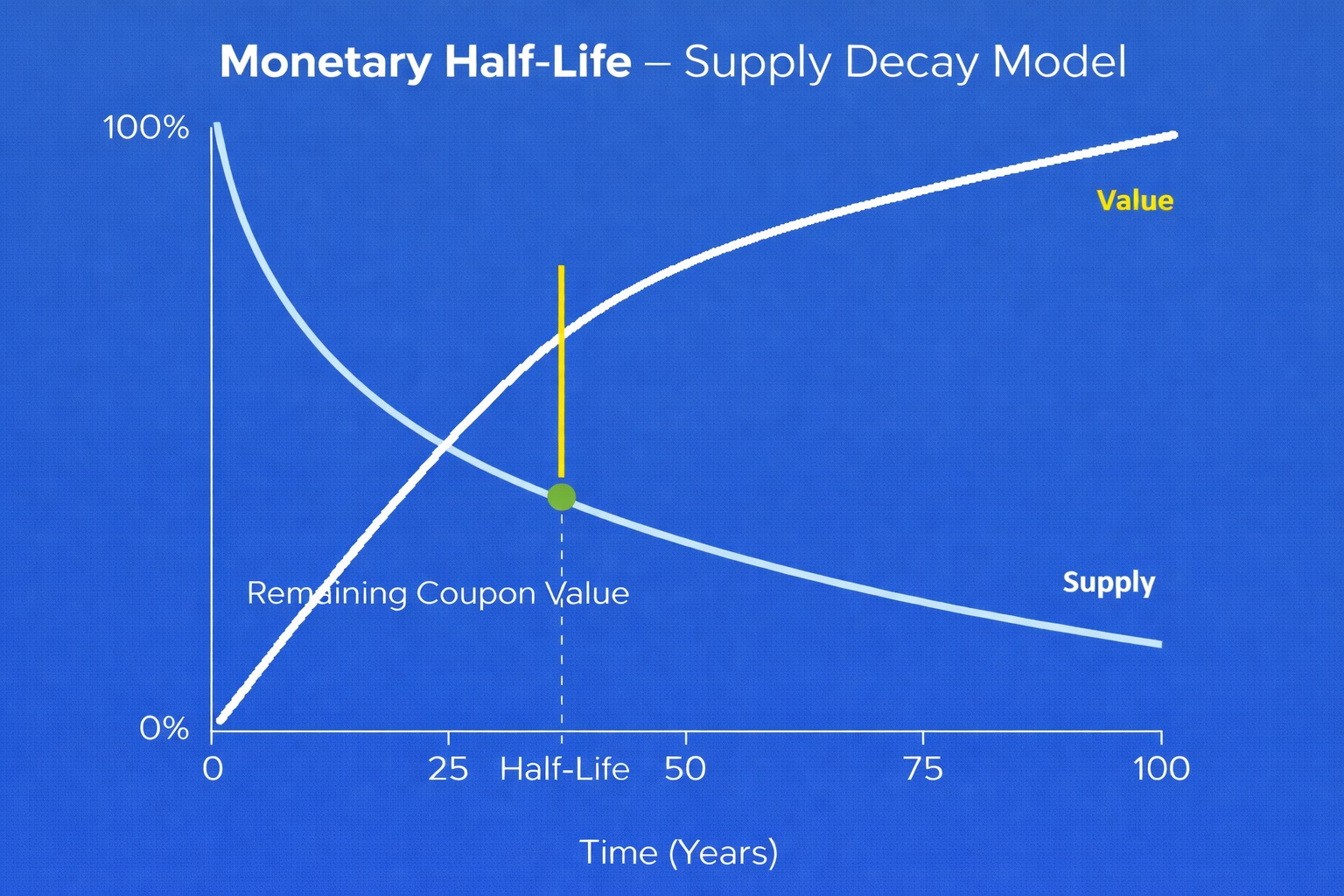 By applying an atomic half-life model, the Monetary Half-Life burn engine reduces supply based on exponential decay over time. This approach produces a predetermined and mathematically defined supply outcome at any point along the curve.